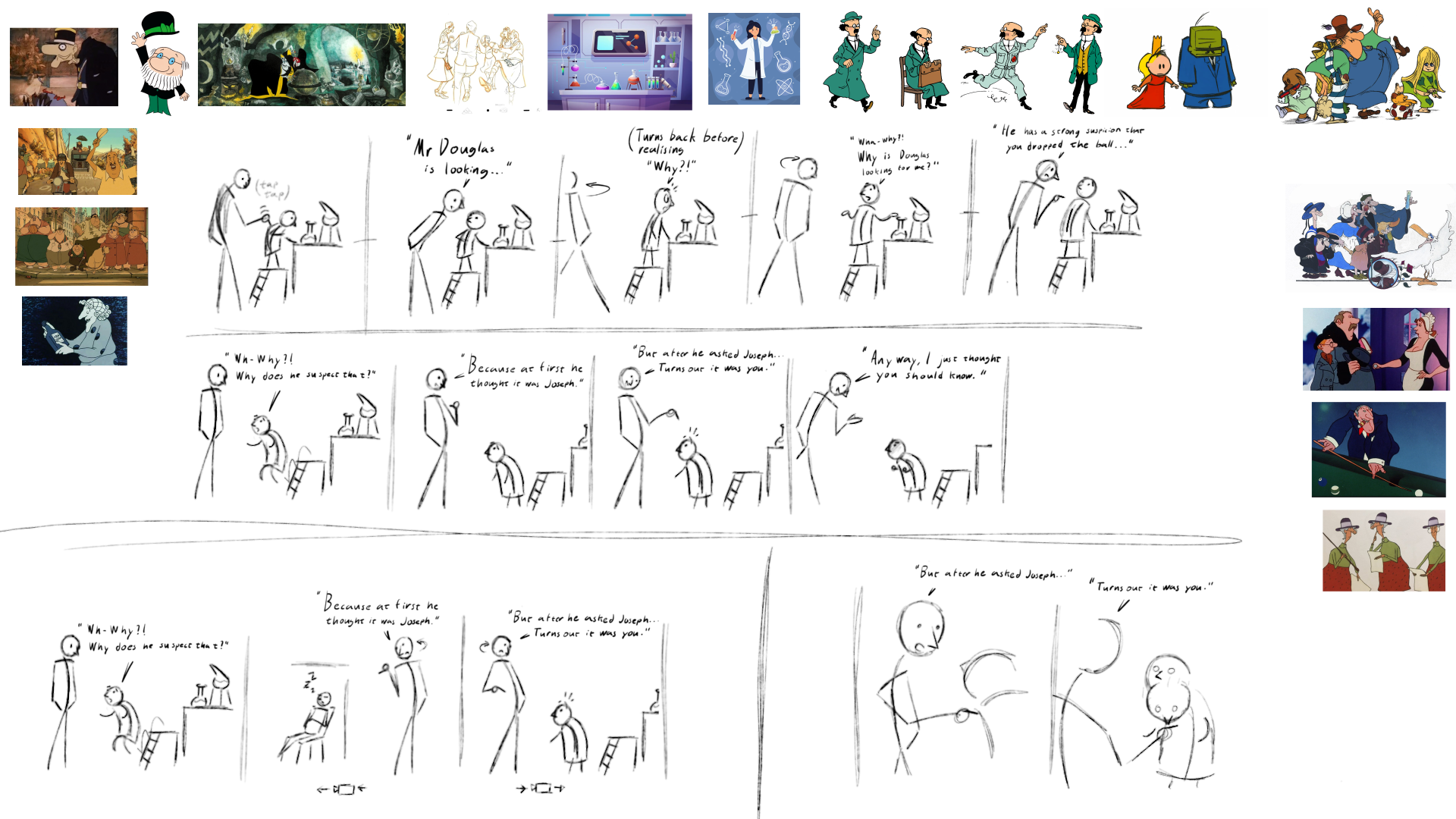 The storyboard above is from my first ever animation involving dialogue using two characters. Taking the audio from an episode of 'Friends', I imagined a scene involving a nervous scientist being bullied by his sly and smug benefactor.